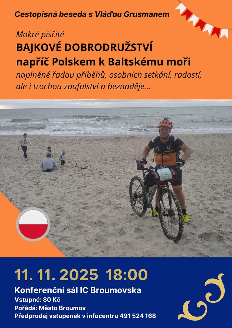 Město Broumov zve srdečně na cestopisnou besedu s Vláďou Grusmanem o "mokrém, písčitém bajkovém dobrodružství naplněném řadou příběhů, osobních setkání, radostí, ale i trochou zoufalství a beznaděje..."
