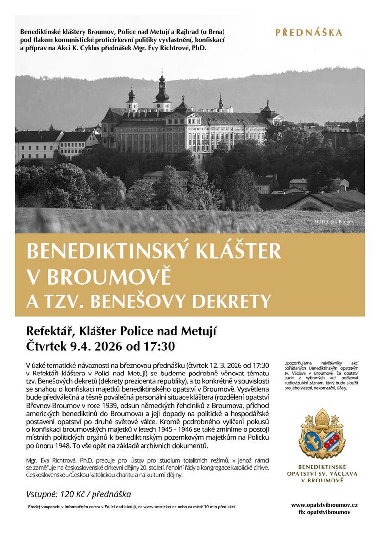 V úzké tematické návaznosti na březnovou přednášku (čtvrtek 12. 3. 2026 od 17:30 v Refektáři kláštera v Polici nad Metují) se budeme podrobně věnovat tématu tzv. Benešových dekretů (dekrety prezidenta republiky), a to konkrétně v souvislosti se snahou o konfiskaci majetků benediktinského opatství v Broumově. Vysvětlena bude předválečná a těsně poválečná personální situace kláštera (rozdělení opatství Břevnov-Broumov v roce 1939, odsun německých řeholníků z Broumova, příchod amerických benediktinů do Broumova) a její dopady na politické a hospodářské postavení opatství po druhé světové válce. Kromě podrobného vylíčení pokusů o konfiskaci broumovských majetků v letech 1945-1946 se také zmíníme o postoji místních politických orgánů k benediktinským pozemkovým majetkům na Policku po únoru 1948. To vše opět na základě archivních dokumentů.