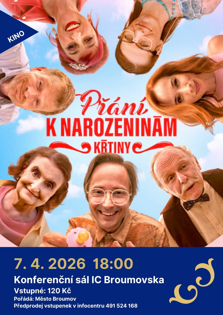 Město Broumov vás zve na promítání české rodinné komedie Přání k narozeninám. Přijďte si užít večer plný humoru a nečekaných situací, které přinese jedna (ne)obyčejná oslava.