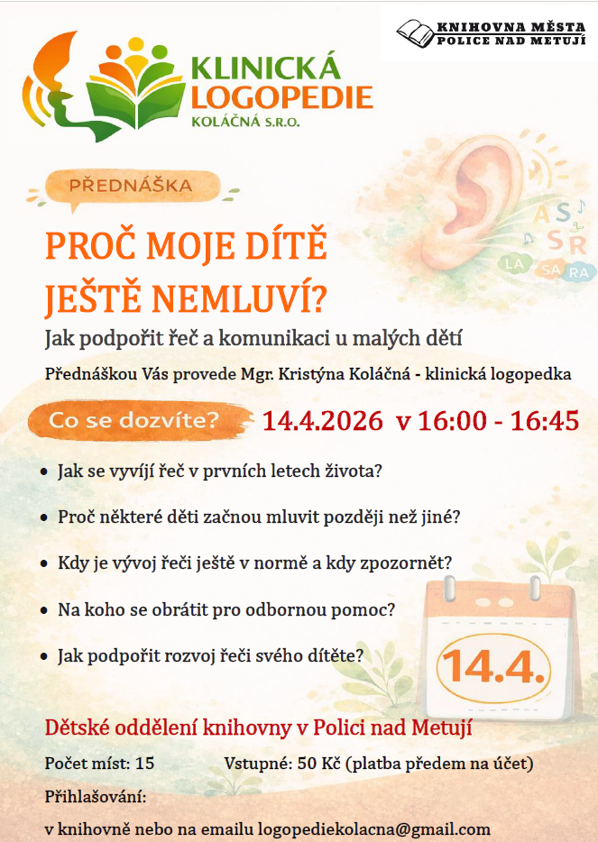 V úterý 14. dubna 2026 se od 16:00 do 16:45 v dětském oddělení knihovny uskuteční odborná přednáška klinické logopedky Mgr. Kristýny Koláčné. Dozvíte se, jak se vyvíjí řeč v prvních letech života, proč některé děti začínají mluvit později a jak můžete rozvoj komunikace u svého dítěte podpořit.
