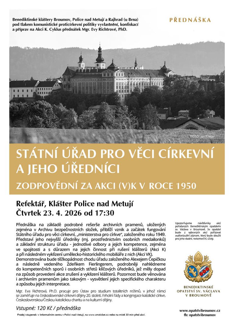 Přednáška na základě podrobné rešerše archivních pramenů, uložených zejména v Archivu bezpečnostních složek, přiblíží vznik a začátek fungování Státního úřadu pro věci církevní, „ministerstva pro církve“, založeného roku 1949. Představí jeho nejvyšší úředníky (mj. prostřednictvím osobních medailonků) a základní strukturu úřadu ‒ jednotlivé odbory a jejich kompetence, zejména ve spojitosti a s důrazem na jejich činnost při rušení klášterů (Akci K) a při následném vyklízení umělecko-historického mobiliáře z nich (Akci VK).