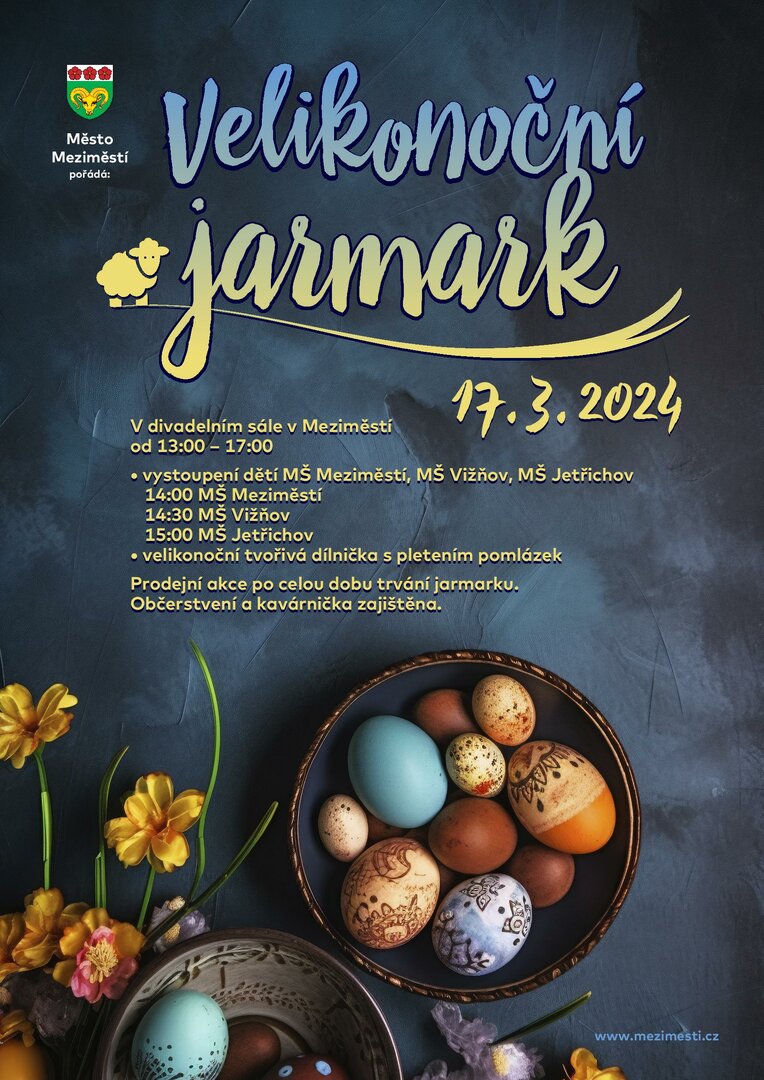 Město Meziměstí vás srdečně zve na velikonoční jarmark. Součástí jsou vystoupení dětí z mateřských škol a tvořivé dílničky. Kavárnička zajištěna.