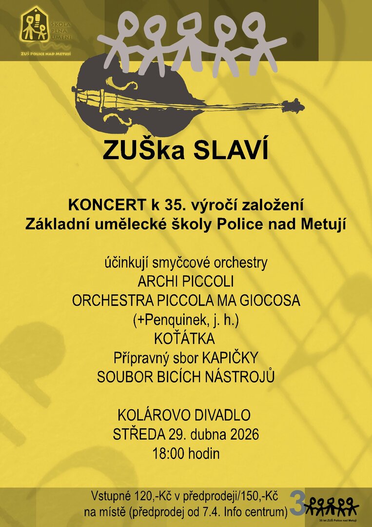Základní umělecká škola Police nad Metují vás zve na slavnostní koncert u příležitosti 35 let od svého založení. V úterý 29. dubna 2026 od 18:00 v Kolárově divadle vystoupí smyčcové orchestry Archi Piccoli, Orchestra Piccola Ma Giocosa (s hostujícím Penquinem), Koťátka, přípravný sbor Kapičky a soubor bicích nástrojů. Přijďte oslavit toto jubileum společně s mladými talenty.